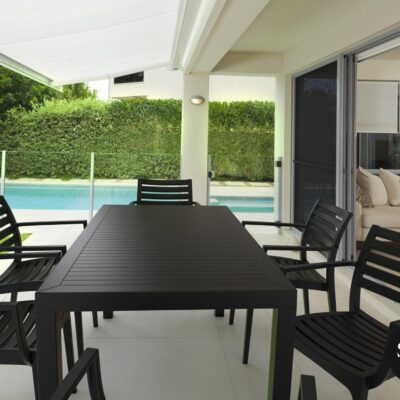 Elevate your outdoor spaces with our 5 Piece Outdoor Bar Table Setting, featuring the Vegas Bar Table 100/140 and Ares